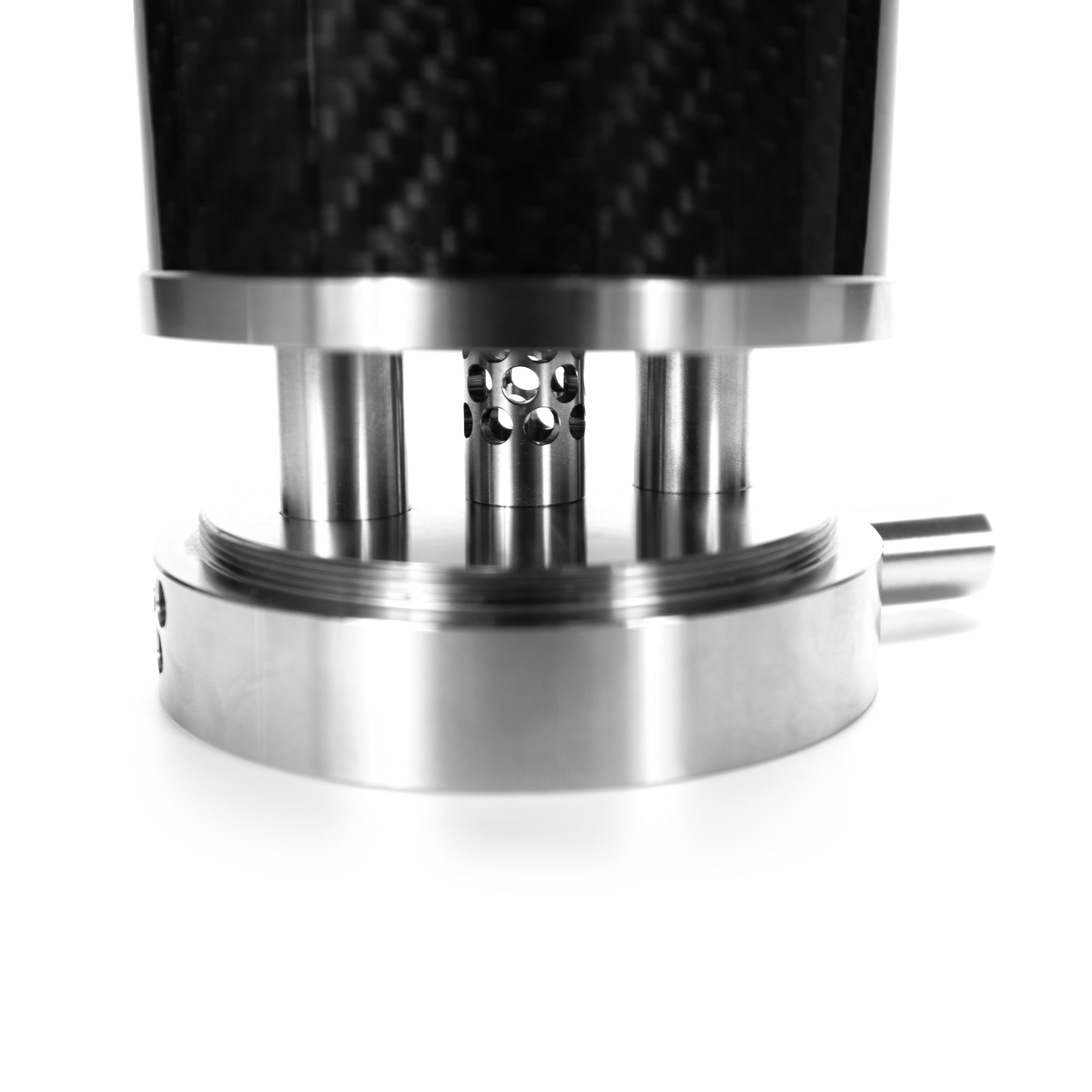 The body of the VYRO One V3 is made of genuine carbon fiber or PVC, not glass, making it ideal for festivals and offering exceptional stability. The VYRO One V3's design ensures a low center of gravity, providing stable support even at its compact size and preventing tipping. The hose connection is located at the bottom of the One to prevent kinking or the hookah from tipping over while smoking. The VYRO One also features an integrated diffuser for a smooth draw. The airflow and overall smoking experience have also been improved in the One V3.
